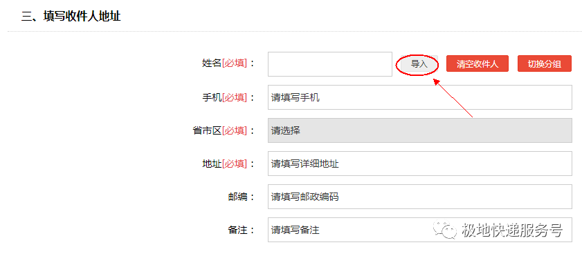 5、填写收件人地址,或者点击“导入”,选择列表中已有的收件人信息;